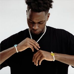 Elevate your style with this unique pearl bracelet, handcrafted with genuine freshwater pearls. At its heart is a beaded blue smiley face, meticulously created over an hour, radiating positivity with every glance. Originally purchased direct from the maker for $50.
