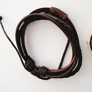 3 bracelets and one watch all in matching chestnut tobacco brown leather or leather PU.