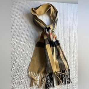 This stylish scarf features a timeless plaid design in tan and black, crafted from a soft, lightweight material. The fringe detailing adds a classic touch, making it a versatile accessory for any wardrobe.