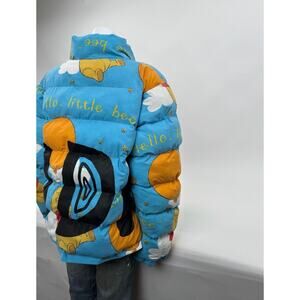 Stand-out streetwear statement piece from Die.Go Studios. This vibrant blue puffer jacket features an allover “Winnie The Pooh” inspired graphic design with bold colors, playful artwork, and a standout cartoon aesthetic. Designed as one size, it offers an oversized, relaxed fit suitable for most adults.