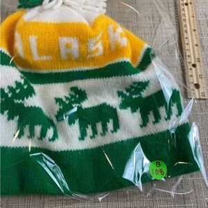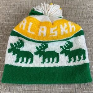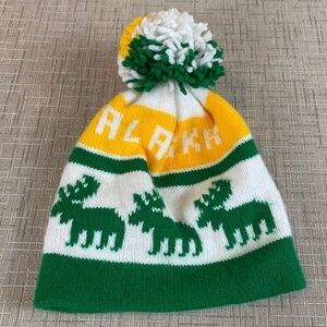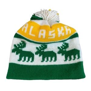Unisex Alaska White Green Yellow Moose Design Knit Hat with Pom