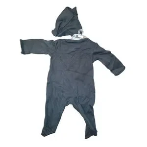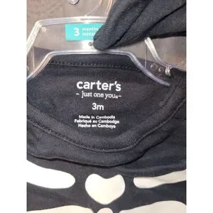 This Carter's "just one you" baby skeleton Halloween costume, size 3 months, includes a black long-sleeved romper and a matching black pointed hat. The romper features white skeleton bone graphics on the front, with additional orange and yellow candy designs on the torso. It has snap closures at the crotch and shoulder for easy changing. The garment is made of 100% cotton.