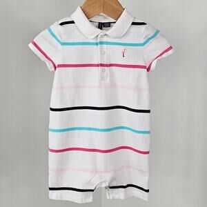 Janie and Jack white stripe flamingo polo shortall. SMALL STAIN ON THE BACK.