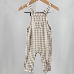 Rylee + Cru tan gingham checkered print coveralls. Saddle snap closure. MULTIPLE SMALL BLEACH STAINS on front and left leg. See pictures.