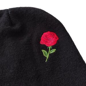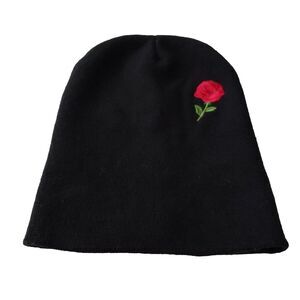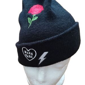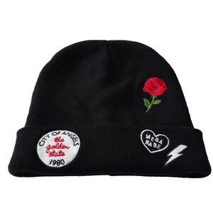 Unisex Black Beanie Skater Hat. Embroidered graphics and words: City of Angels the Golden State 1980, Mega Babe stitched inside of a heart, a Red Rose and a Lightning Bolt. 8-10 inches height (depending on the fold) x 8.5 inches wide. Clean and ready to wear.