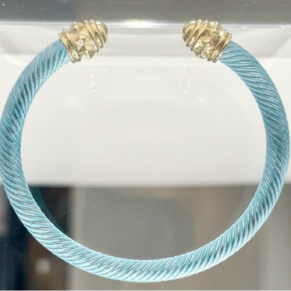 Elegant blue cable bracelet with gold accents. Perfect for any occasion. Color is Caribbean Blue