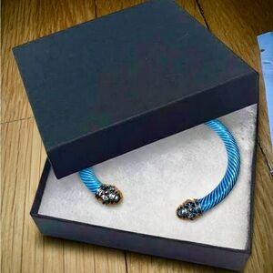 This elegant bracelet features a stunning light Blue band with exquisite gold accents. Perfect for adding a touch of sophistication to any outfit.