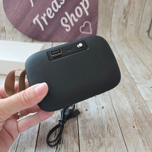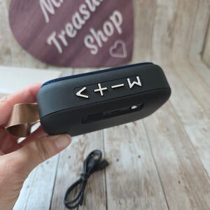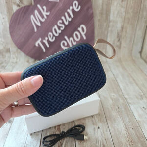 The item is a new portable Bluetooth speaker, still in its original box with tags. It features a rectangular design with a blue fabric front and black rubberized sides. Control buttons are located on the side. It comes with a USB charging cable. The speaker appears to be free of any visible imperfections.