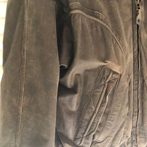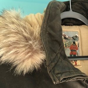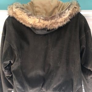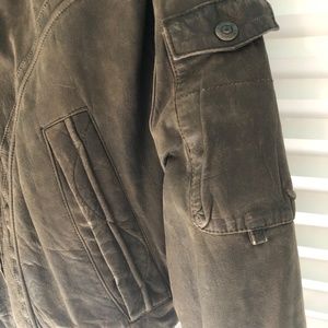 Bomber jacket, olive green leather with fur-lined hood. Zip front with two outside pockets, snap pocket on outside left arm, and left inside breast pocket. This was selling as a men’s jacket by the manufacturer, however was purchased and worn by a female so the jacket is definitely unisex.