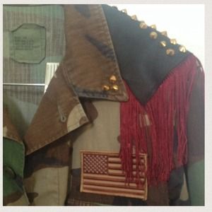 Vintage custom Hi/low camo jacket with leather shoulder patches, maroon/ burgundy fringe and gold studs. Size medium.