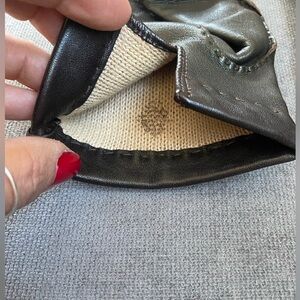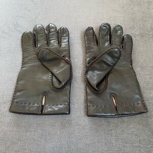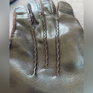 Unisex, dark brown leather gloves. The writing inside has worn off. I think they are cashmere lined. They are in very good condition…. Very soft leather. I would say they are a men’s small or a women’s large., size 8.