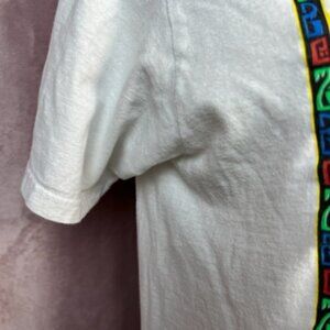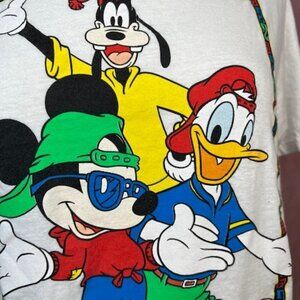 This is a unisex White with Multi Color Disney Distressed Short Sleeve Shirt In A size Small. This shirt is very used and distressed with discoloration stains and fade that may be fixed with bleach on some spots.