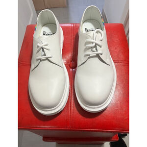 These are a pair of unisex Dr. Martens 1461 Pride shoes in white with a rainbow stripe on the side. They're in new condition with no defects and have only been worn once. The shoes have no scuffs or scratches, and they're in great condition. They're perfect for a casual day out or a night on the town.