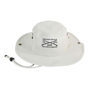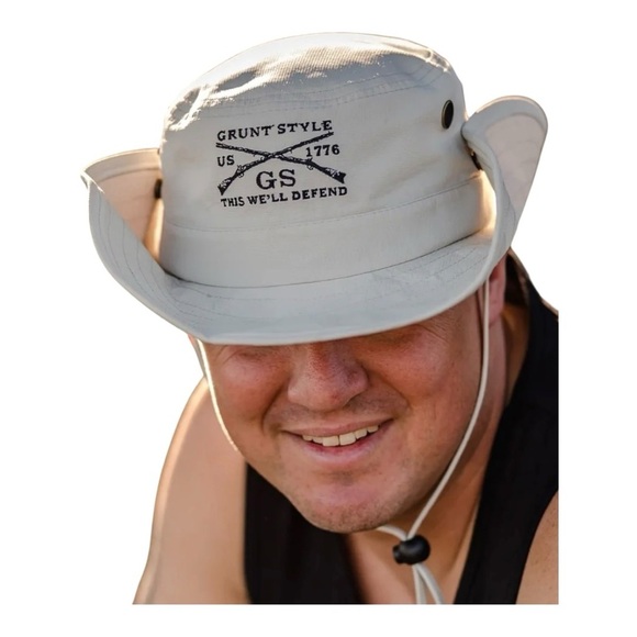 Khaki Grunt Style hat with dark brown logo. Please note that color and shade may vary based on device used to view this item. 100% Polyester. Water Resistant. Adjustable Chin Strap. NWOT. No stains or tears. Smoke free home.