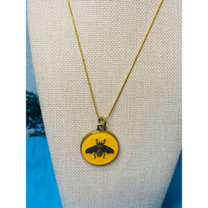 This is a Gucci necklace featuring a round, yellow enamel pendant with a raised, gold-tone bee design. The pendant measures approximately 1 inch in diameter. The necklace chain is a fine, gold-tone snake chain. The back of the pendant is gold-tone metal and is stamped with the Gucci logo and "made in italy." The item appears to be in new condition without tags or original packaging. comes gift boxed