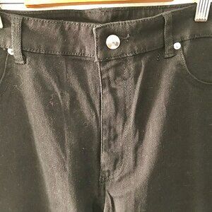 H&M black pants with a button and a zipper. Has two faux pockets on the front and two open pockets on the back. New and never worn before. Has a little stretch to it. Bootcut on the bottom. Has belt loops at the waist. Material is listed as 98% cotton and 2% elastine. Measurements can be found below: