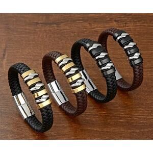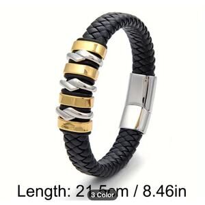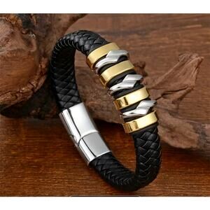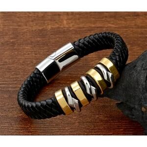 Unisex Handcrafted Braided Faux Leather Magnetic Clasp Bracelet Golden on Black