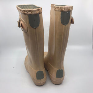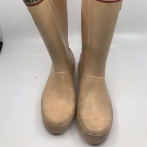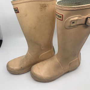 Perfect for wet weather conditions, Rain Boot has been at the heart of the Hunter Original brand since 1956. Formed of natural rubber, each pair is made from 28 hand-cut parts and assembled over three days on an aluminium, before being vulcanized for superior protection! Hunter Original tread pattern, and a comfortable polyester lining. It is recommended that all Hunter boots be worn with socks to protect the wearer's skin from contact with rubber. Good condition. Ready for continued use. Msrp.