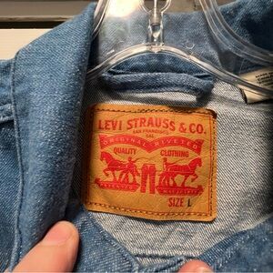 Preowned Unisex Levi Strauss & Co. Sz L Blue Denim Jean Trucker Button Jacket WPL-423, CA00342. This jacket is in great condition - no rips, holes or tears.