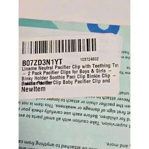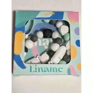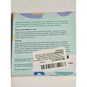 This is a new, with tags and in box, silicone baby teether pacifier clip from the brand Liname. The teether is made of silicone and features a variety of shapes and colors, including white, black, gray, and green. The teether is attached to a white plastic clip with a safety clasp. The teether is approximately 10 inches long. The packaging is a colorful cardboard box with a window that shows the teether. The box includes a label with the product name, brand, and UPC code. The teether is designed for babies and toddlers to help soothe their gums and teeth. It is BPA, Phthalate, Lead, and Cadmium free. The teether is easy to clean and dishwasher safe.