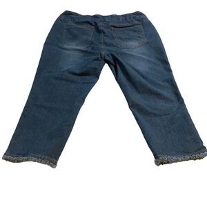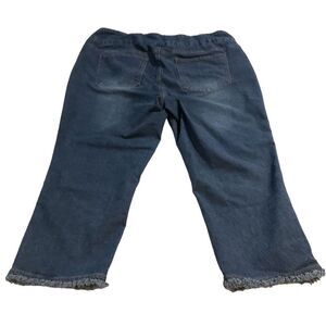 Keywords: Unisex jeans, straight-leg, medium wash, blue denim, frayed hem, mid-rise, zip closure, stretch jeans, casual wear, pre-owned denim, Soft Surroundings, comfortable fit, versatile fashion, adult jeans, everyday style.