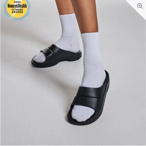 Sizes are in women’s..Step into unparalleled comfort with OOFOS Black Sandals, designed for optimal recovery and casual wear. These sandals feature a minimalist design with a single wide strap and a contoured footbed for superior support. Perfect for post-workout relaxation, they offer a slip-on style for easy wear.