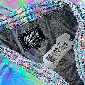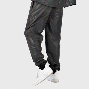 Fresh from theOfficialBrand.com is this unworn (worn only to model for these photos), pair of RFLCTIV Squid Ink Dichroic Rainbow Reflective Track Pants.