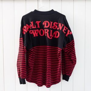 Unisex SMALL Walt Disney World Pirates of the Caribbean Striped Spirit Jersey.... NEVER WORN I bought it and removed the tags, LOVE the shirt but I just never wore it. It's black and red with a striped print, pirate head on the front, and Walt Disney World printed on the back.