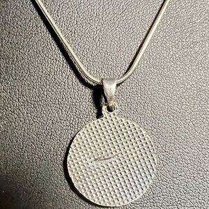 Good condition. Scratch or manufacturing defect on the back of pendant. Chain and pendant or tarnished, consistent with age.