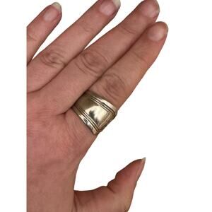 Size 9 spoon ring created from sterling silver plated flatware. Simple, more angular design, great for a unisex or more masculine look.