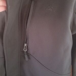 Unisex Snozu Black Performance Jacket. Kids Size Large 14/16. Removable Hood. Two Hand Pockets and One Chest Pocket. Like New. Double Zippered And Velcro Front Body. Adjustable Sleeves at Wristline. Shell- 96% Polyester 4% Spandex.