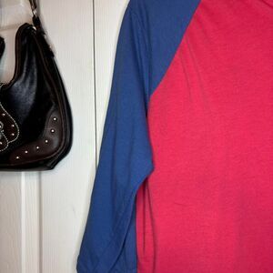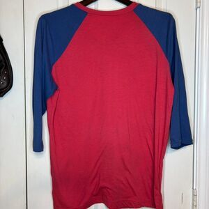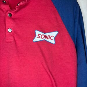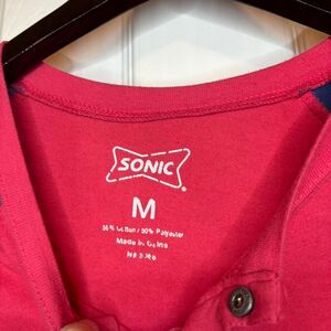 This red and navy raglan tee is an official Sonic Drive-In work shirt with a henley-style snap button front and bold retro-style logo on the chest. Made from a soft cotton blend with three-quarter length sleeves, this top works for cosplay, uniform collectors, or just repping your favorite fast food spot with ironic flair. Tag says size medium. No major flaws noted.
