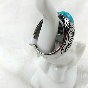 Women's / Men's Unisex Chunky Boho Statement Style Ring, Faux Blue Turquoise Stimulated Center Oval Stone, Hypoallergenic Stainless Steel Metal, Heavy Duty High Quality Metal, Intricate Swirl Boho Engraving On Sides.