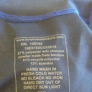 This fabulous unisex rash guard provides UPF50 sun protection. Perfect for any outdoor sport, or water activity. Easy pull on style. Navy and light blue. Laying flat, Small measures 17". Medium measures 19". Lightweight, stretchy and super comfortable. My model in first 2 pics is 5'8", wearing medium. Chest 36".