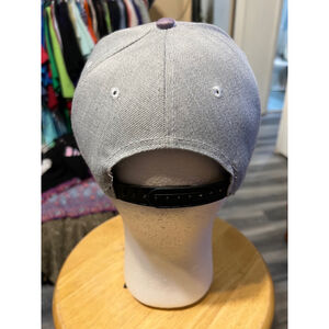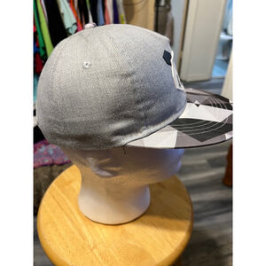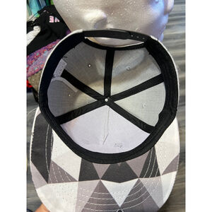 "item_description": "This pre-owned baseball cap features a gray crown made of 80% cotton and 20% polyester. The brim has a geometric black, white, and gray pattern. A white geometric panda design is affixed to the front. The cap has a black adjustable snapback closure. The interior shows minimal signs of wear. The cap is labeled as 'One Size Fits All' and was made in China."