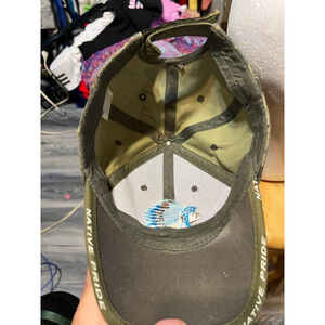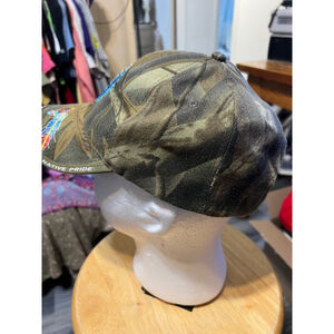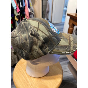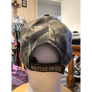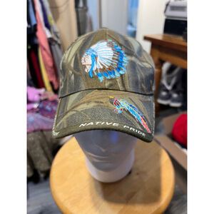 "item_description": "This is a pre-owned camouflage baseball cap. The cap features an embroidered Native American chief head with a blue headdress on the front and an embroidered bird on the bill. The words \"NATIVE PRIDE\" are embroidered on the bill and on the adjustable strap. The cap is made of 100% acrylic and is labeled as \"One Size Fits All\". There are no visible imperfections."