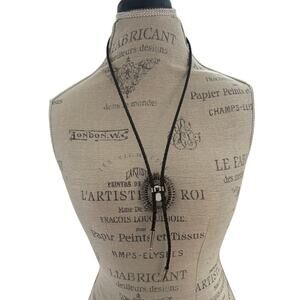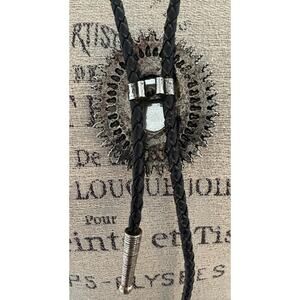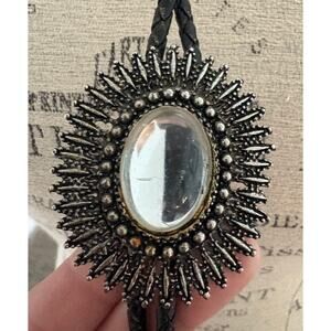 Ships fast from California! Vintage bolo tie with braided leather cord, tension-back slide, and an ornate silver-tone sunburst setting featuring a large glass cabochon or polished acrylic stone. Dates to the 1960s–1980s based on clasp style. A bold festival-ready look for Coachella, Burning Man, rodeos, and western-themed events. Pairs perfectly with denim, fringe, leather jackets, or layered jewelry for that cowboy-core meets rocker vibe. Unisex fit for men or women. Handmade or small batch artisan-crafted with great patina and retro flair.