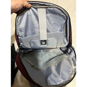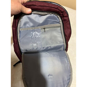 "item_description": "This is a Zomake backpack, new without tags or box. It features a burgundy exterior with gray trim. The interior is lined with gray fabric and includes multiple compartments, including a padded laptop sleeve. The backpack has adjustable black straps, a top handle, and a USB charging port on the side. The exterior material appears to be a durable, water-resistant fabric. There are no visible imperfections."