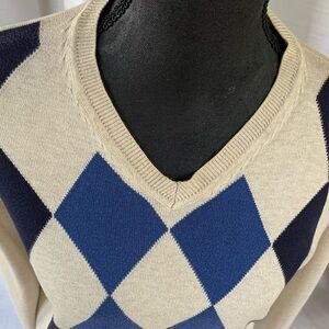 Made in Cambodia of 100% cotton, this v-neck pullover will see you through all 4 seasons. Beige background with contrasting diamonds in navy and denim blue. Manufactured by Springfield, a European brand, this lightweight sweater is labelled size M3 (EUR, UK, KOR) and 38 (MEX). P2P this preowned top measures 22”. Would fit a ladies size medium - large. A great weight for layering under a jacket or over a tee/button down.