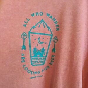 The front says “All who wander are looking for beer”, Beer is OK tee, Size L, Unisex, short sleeve