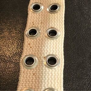 Unisex beige and cream two tone belt with 2 rows of grommets. Buckle and grommets are silver tone. Pre-owned. Some fraying noted around buckle prongs and a few of the holes. These are shown in pictures. Size XL