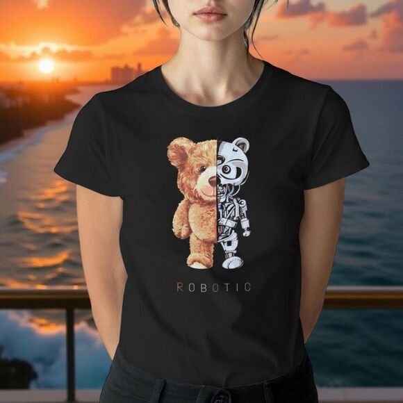 Unisex Black Robotic Bear Graphic T shirt Size M