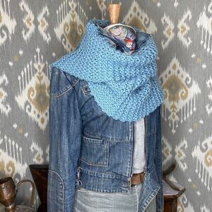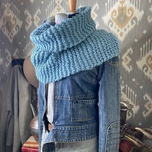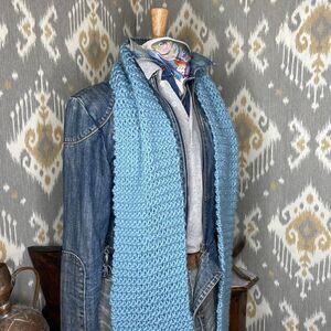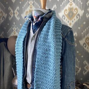 Hand-knit Oblong Scarf in a medium weight Alpaca yarn in a soft aqua blue. Laid flat it measures 64" length, 7” width. Great gift. Hand wash, lay flat to dry. Nuances and imperfections are natural to hand-knit items, and are not defects, but provide lovely character. See pics.