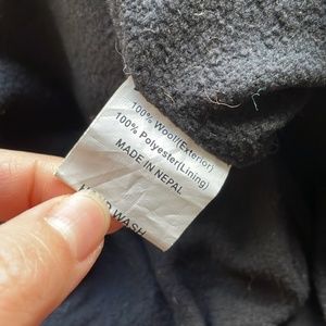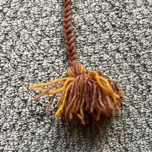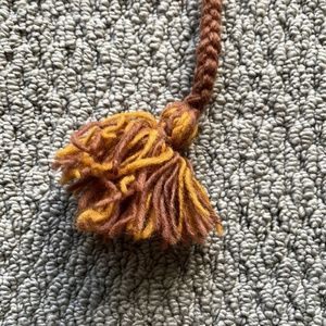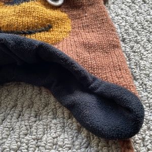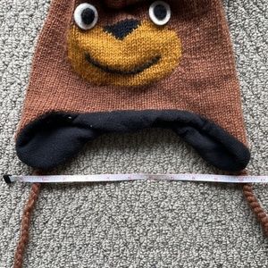 Funny bear face beanie with pom pom strings. New without tags and has never been worn. Measures 19" in full length, 10.5" wide, and exterior fabric is 100% wool.