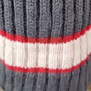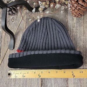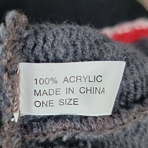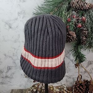 100% Acrylic ribbed knit stocking cap with stripe. Fleece lined around edge for comfort. Good pre-owned condition