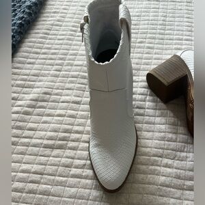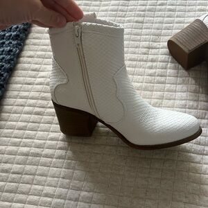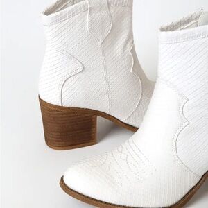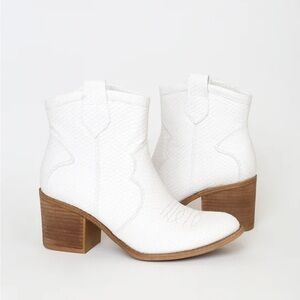 Add the perfect amount of Boho flair to your next look with the Dirty Laundry Unite White Snake Ankle Booties! Faux leather, with a cool textured snake print, shapes these trendy boots that have an almond toe and an ankle-high shaft complete with Western-inspired seam detailing and a pull tab at the outstep. 6" zipper at the instep.