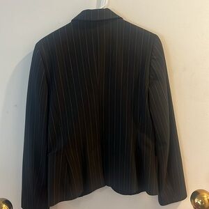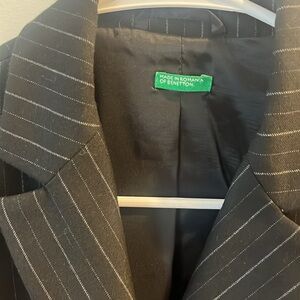 This sophisticated black blazer from United Colors Of Benetton features a structured fit with notched lapels, offering a timeless and elegant look. Crafted with attention to detail, it provides a refined silhouette perfect for formal occasions. size 44 in excellent condition.. armpit to armpit 18”..length 24”