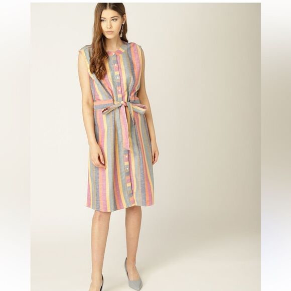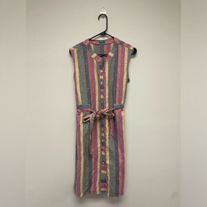 United Colors Of Benetton Yellow & Pink Striped Belted Linen Blend Shirt Dress M
