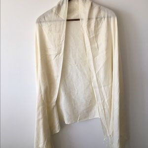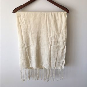 Ivory scarf that can be used as a regular scarf or a wrap. Looks great in any style! Great for the Fall and Winter. comfortable and light. Worn but in good condition.
