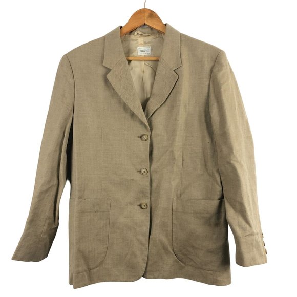 Women's vintage tan brown linen blend menswear inspired blazer suit jacket.